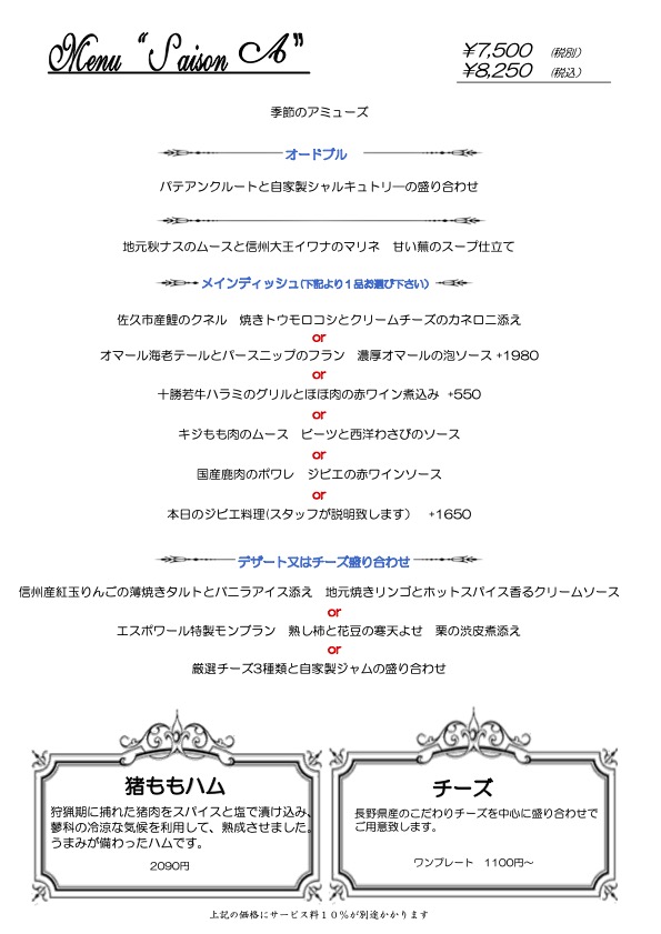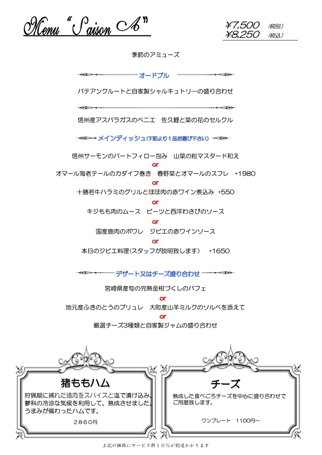 ランチAコース 8,250円(税込) 信州でしか味わえない食材をエスポワールでしか味わえないアレンジでお楽しみください。 ランチAコースはメインディッシュを肉料理か魚料理から一品お選びください。 (ランチBコースではメインディッシュを肉料理と魚料理の両方お楽しみ頂けます。) 料理ギャラリー
