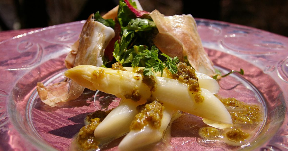 ホワイトアスパラの冷製 ふきのとうの香り 自家製生ハム添え